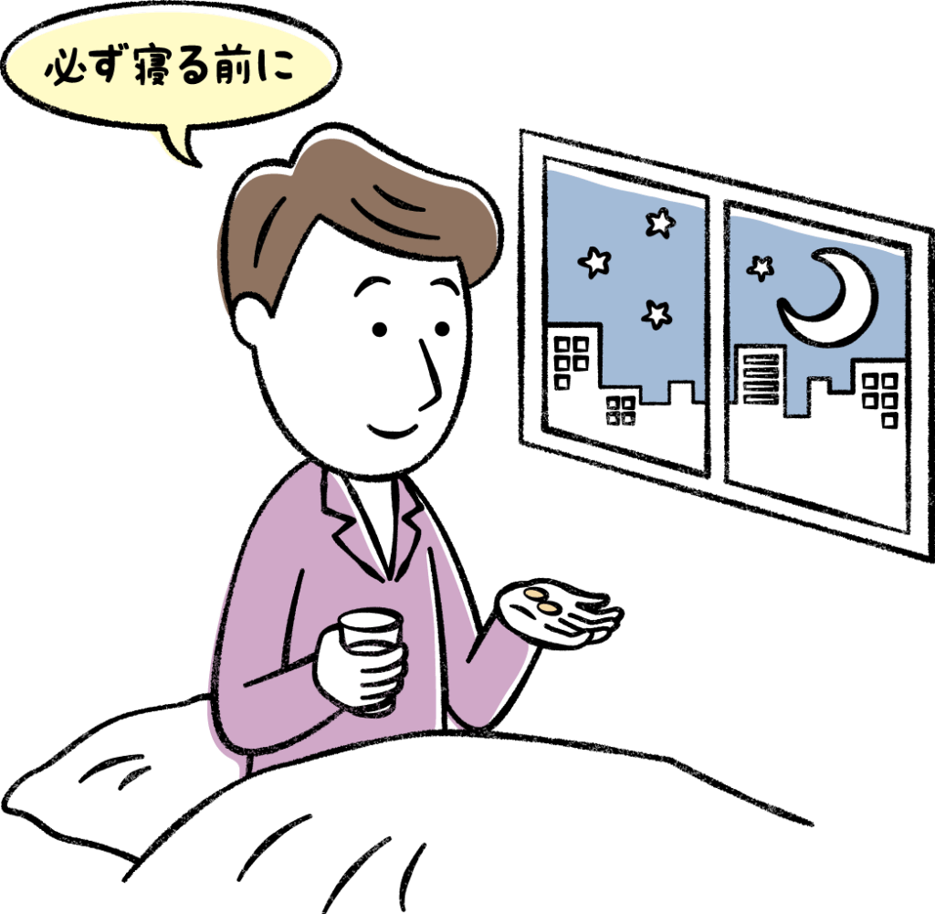 睡眠薬によっては、食後すぐに服用すると体内に吸収される際に影響を受け、血液中のお薬の濃度にも関係して効果が出にくくなる場合があります。夕食後、ある程度の時間をおいて、眠る直前に服用するようにしましょう。