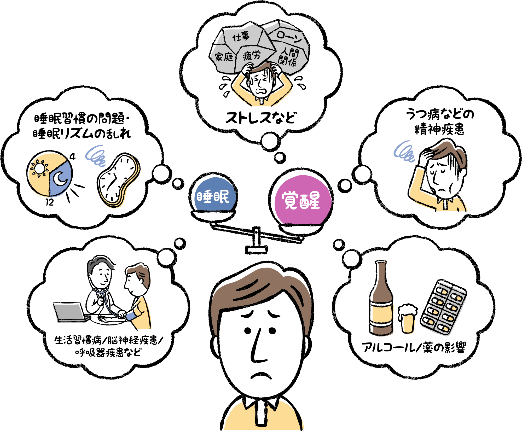バランスの崩れる原因には、生活習慣病/脳神経疾患/呼吸器疾患など、睡眠習慣の問題・睡眠リズムの乱れ、ストレス、うつ病などの精神疾患、アルコール/薬の影響などがいわれています。