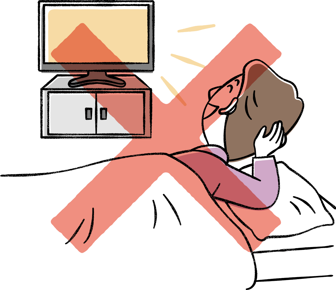 - 寝床では、本を読んだり、テレビを見たり、ものを食べたりせず、眠くなければ別の部屋で過ごすようにしましょう。