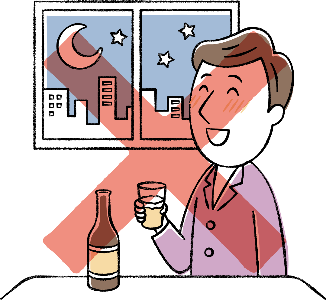 - また、寝酒が続くと体がアルコールに慣れ、量を増やさないと眠れなくなり、依存症に陥ってしまう危険性もあるので注意しましょう。